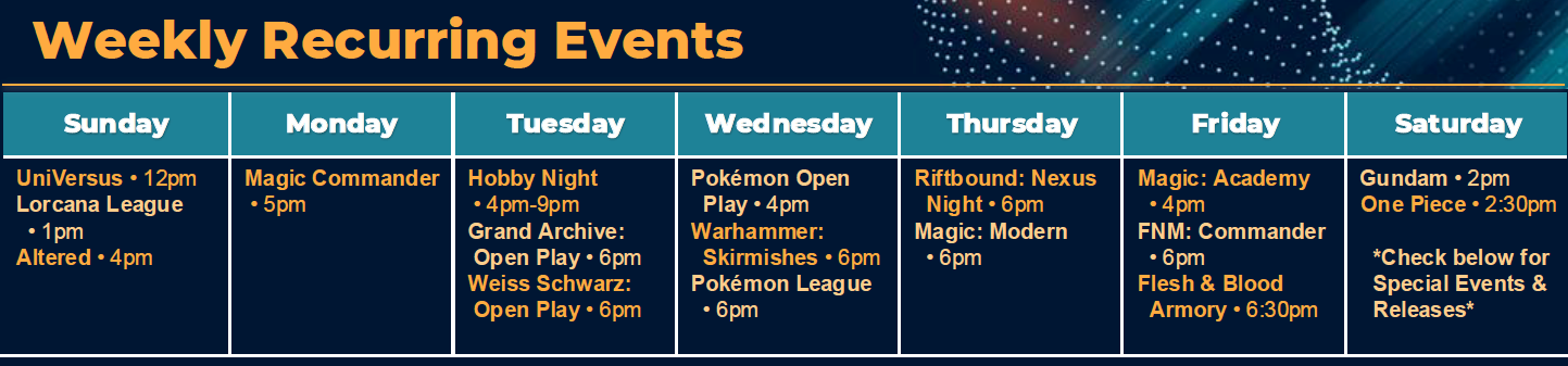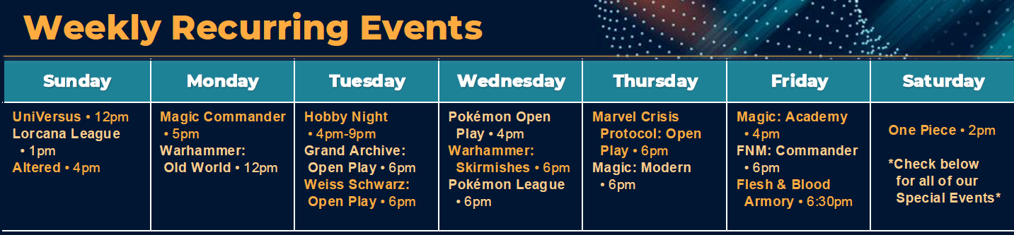 Check our store calendar for upcoming tournaments, special release events, and seasonal celebrations, and join in the fun today.